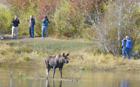 American Moose in lake with trees during autumn with photographers watching