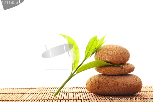 zen stones with green leaves and copyspace showing wellness