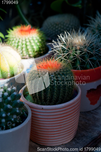 colorful cacti cactus plants on little pots on shadow with sunlight ray
