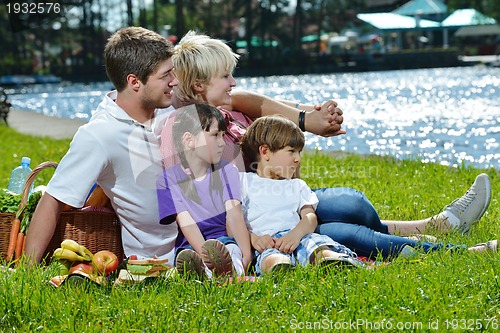 Happy young family playing together with kids and eat healthy food in a picnic outdoors