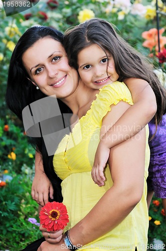 beautiful mom and daughter outdoor in garden together with flower have fun and hug