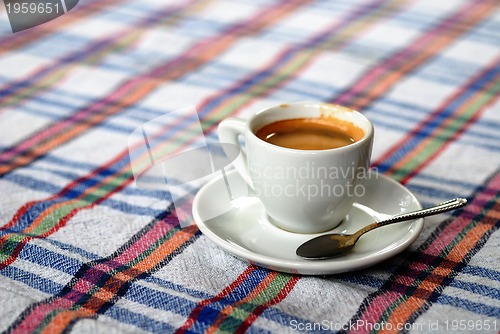 Cup of coffee on a colorful tablecloth