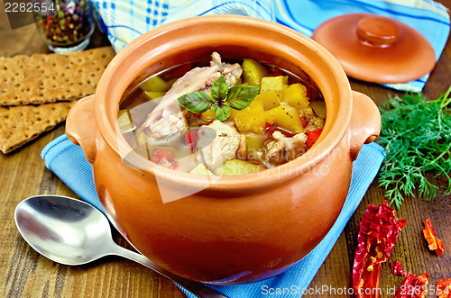 Roast with chicken meat, potatoes and red pepper in a clay pot, blue napkin, spoon, crispbreads, dill and pepper in a jar on the board