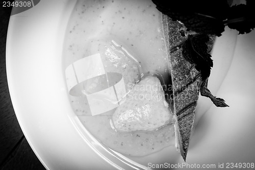 Chocolate cake wth strawberry and chili on the side
