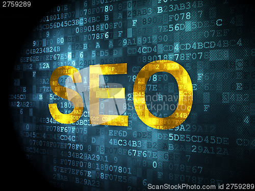 SEO web development concept: pixelated words SEO on digital background, 3d render