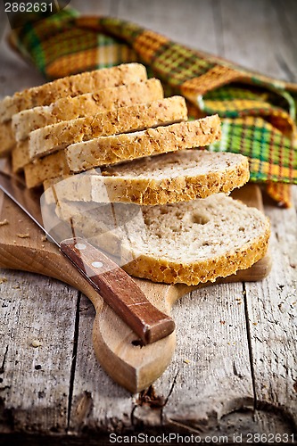 fresh bread slices on wooden board, napkin and knife