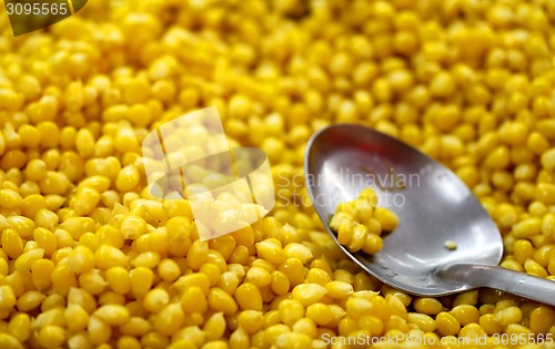 Tasty yellow corn and spoon for eating photographed close-up