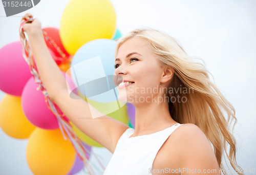 summer holidays, celebration and lifestyle concept - beautiful woman with colorful balloons outside