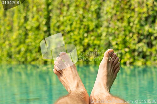 leisure, people, travel and tourism concept - close up of male feet over resort swimming pool