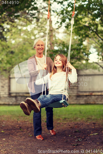 family, happiness, generation, home and people concept - happy grandmother and granddaughter swinging on teeterboard outdoors