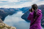 Nature photographer tourist with camera shoots while standing on top of the mountain. Beautiful Nature Norway Preikestolen or Prekestolen.
