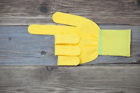 yellow construction gloves points his index finger