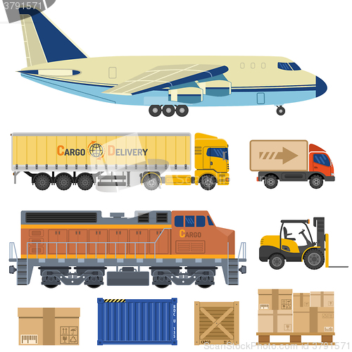 Cargo Transport and Packaging in Flat style icons such as Truck, Plane, Train. for Brochure, Web Site and Printing Advertising on theme delivery of goods.