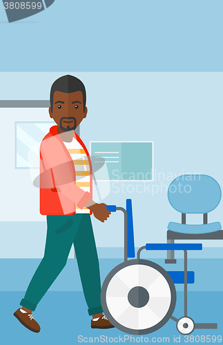 An african-american man pushing empty wheelchair on the background of hospital corridor vector flat design illustration. Vertical layout.
