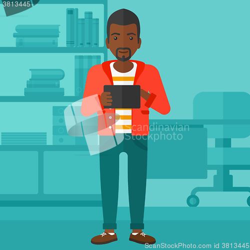 An african-american man using a tablet computer on the background of business office vector flat design illustration. Square layout.