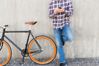 people, style, technology, leisure and lifestyle - close up of young hipster man in earphones with smartphone and fixed gear bike listening to music on city street