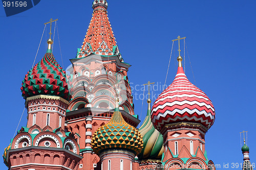 Traditional Russian architecture atop the The Pokrovsky Cathedral (St. Basil's Cathedral) on Red Square in Moscow. The cathedral was built between 1555 and 1561 by the architects Barma and Postnik Yakoviev.
