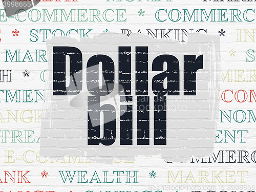Banking concept: Painted black text Dollar Bill on White Brick wall background with Tag Cloud