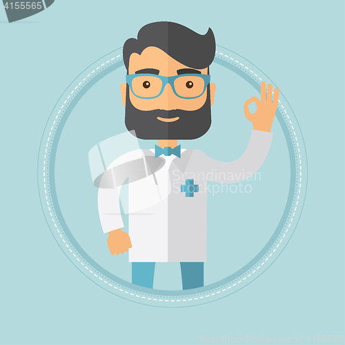 A happy caucasian hipster doctor with the beard showing ok sign. Smiling friendly doctor in medical gown gesturing ok sign. Vector flat design illustration in the circle isolated on background.