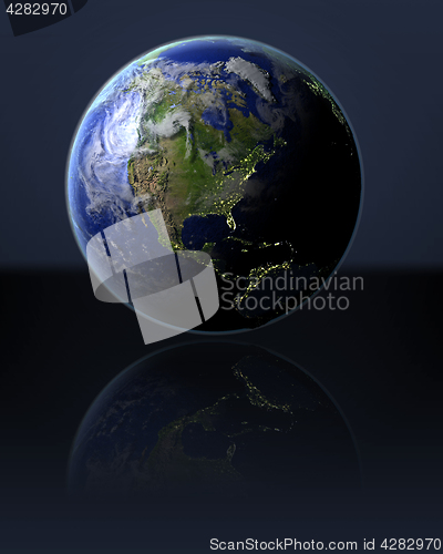 North America on full globe with dark background. 3D illustration with detailed planet surface, atmosphere and illuminated cities. Elements of this image furnished by NASA.