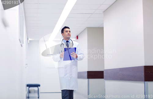 clinic, people, health care and medicine concept - doctor with clipboard walking along hospital corridor