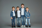 Young boys posing together on gray studio background