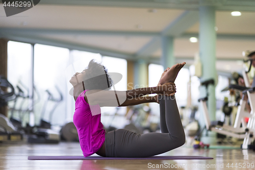 beautiful young african american woman exercise yoga in gym