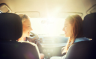 summer vacation, holidays, travel, road trip and people concept - happy teenage girls or young women driving in car