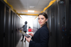 Female IT engineer working on a tablet computer in server room at modern data center