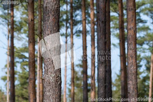 Focus on one pine tree trunk in a bright forest by a blue sky