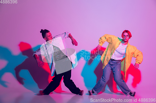 Image of Young man and woman dancing hip-hop, street style isolated on studio background in neon light