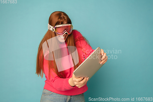 Playing tablet. Caucasian woman\'s portrait on blue studio background with copyspace. Beautiful female model in pink sweatshirt. Concept of human emotions, facial expression, sales, ad, fashion.