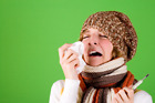 portrait of a cold girl sneezes with handkerchief and thermometer on green background