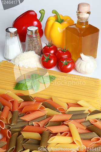 Ingredients for a pasta meal include tomatos, oil, garlic, cheese, salt, pepper and different kind of pasta