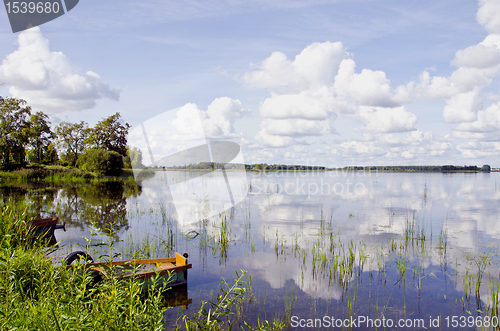 Amazing summer lake landscape, Boats on coast, clouds in sky and reflections on water.