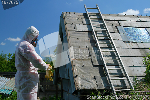 Asbestos removal worker. Dangerous waste disposal - professional works with old architecture.