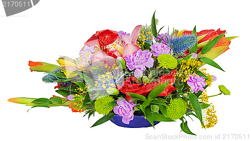 Floral bouquet of orchids, gladioluses and carnation arrangement centerpiece in glass vase isolated on white background.