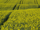 blooming rape field with tractor tracks