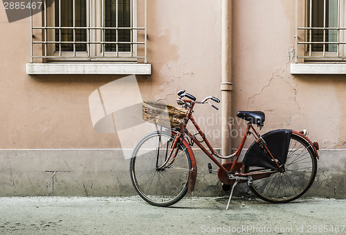Red old Italian bicycle on sunlight. Ancient buildings