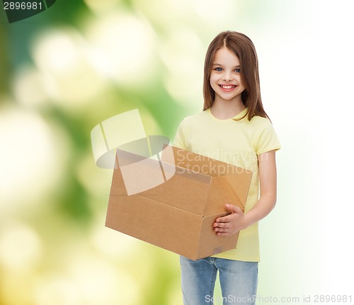 advertising, childhood, delivery, mail and people - smiling little girl holding open cardboard box over green background