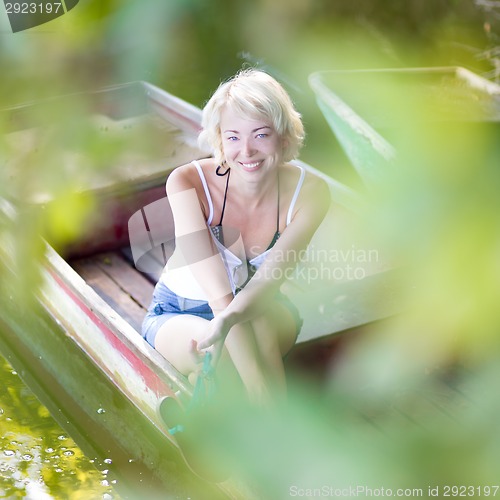 Relaxed young blonde woman enjoying the sunny summer day on a vintage wooden boats on a lake in pure natural environment on the countryside.