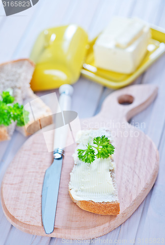 bread with butter on board and on a table