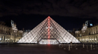 Illuminated glass pyramid at the Louvre, Paris at night in a symmetrical view of the historic surrounding buildings of the museum