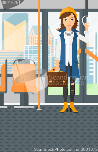 A woman with a suitcase standing inside public transport vector flat design illustration. Vertical layout.