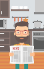 A hipster man with the beard reading the newspaper on the background of kitchen vector flat design illustration. Vertical layout.