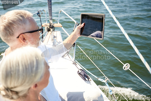 sailing, technology, tourism, travel and people concept - close up of senior couple with tablet pc computer on sail boat or yacht deck floating in sea
