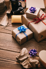 Close up composition of presents wrapped in craft paper with blue and red ribbons on wooden table.