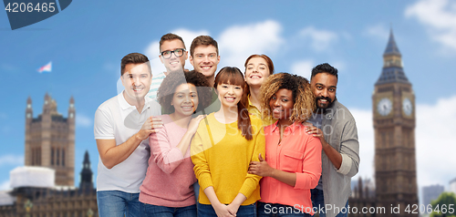 travel, tourism, diversity, friendship and people concept - international group of happy smiling men and women over london city background