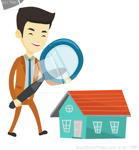 Asian man using a magnifying glass for looking for a new house. Man with magnifying glass checking house. Man analyzing house with loupe. Vector flat design illustration isolated on white background.