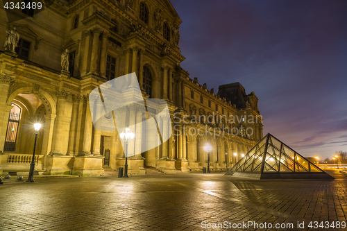 PARIS, FRANCE - DECEMBER 9, 2016: View of famous Louvre Museum with Louvre Pyramid at evening. Louvre Museum is one of the largest and most visited museums worldwide.